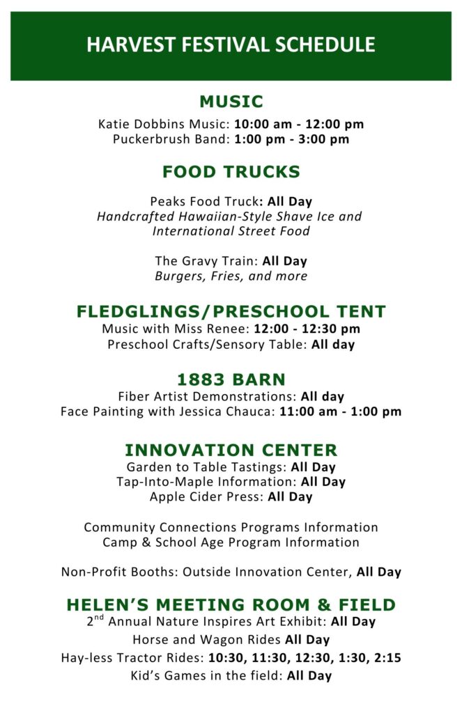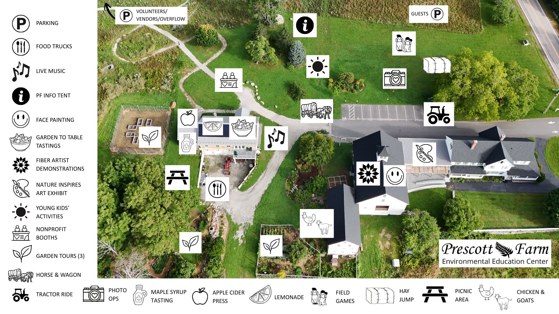 The Prescott Farm Harvest Festival is our most popular community event of the year, drawing over 800 people of all ages to our property for a day of fun on the farm. Admission to the public is free! Featured activities at the Harvest Festival include Featured activities at the Harvest Festival include horse-and tractor-drawn wagon rides, field games, a hay jump, apple cider press, natural crafts, face painting, nature-based stories and activities, fiber artist demonstrations, and food trucks! PLUS – Neverland characters by Powerhouse Theatre Collaborative will be out and about the property, and live music from Katie Dobbins and the Puckerbrush Band! Guests can also enjoy Prescott Farm’s 160-acre property at their own pace, including 3 miles of hiking trails, a natural PlayScape, and heirloom gardens for all to enjoy.